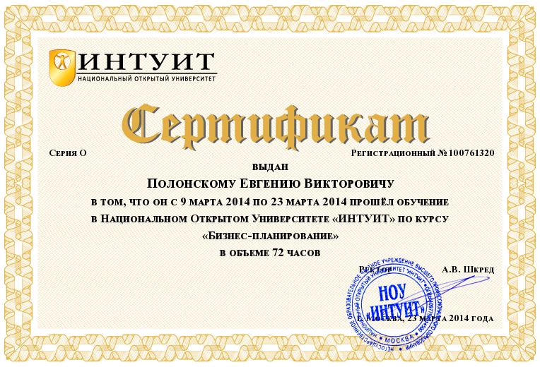 - 8марта – 22 марта 2014 г. - Обучение по программе «Бизнес-планирование», г. Москва, НОУ ВПО «Национальный открытый университет «Интуит» Сертификат о повышении квалификации №100761263; (72 ч.)