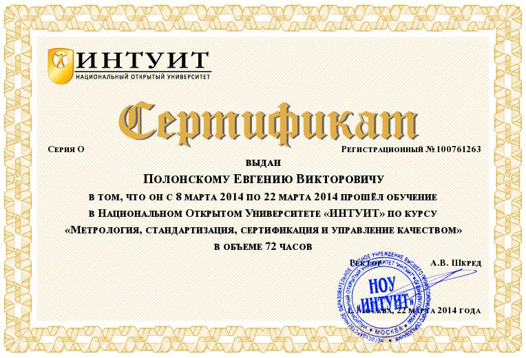 - 8марта – 22 марта 2014 г. - Обучение по программе «Метрология, стандартизация, сертификация и управление качеством», г. Москва, НОУ ВПО «Национальный открытый университет «Интуит» Сертификат о повышении квалификации №100761263; (72 ч.)