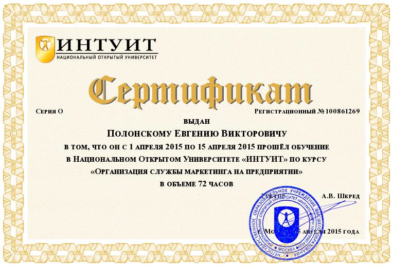 - 1 апреля 2015 - 15 апреля 2015 - Обучение по программе "Организация службы маркетинга на предприятии" г. Москва, НОУ ВПО "Национальный открытый университет "Интуит" Сертификат о повышении квалификации №100861269 (72 ч.)