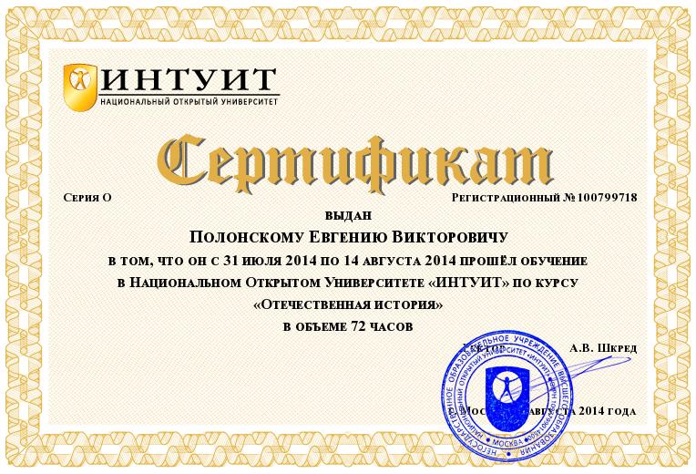 - 31 июля 2014 - 14 августа 2014 г. - Обучение по программе "Отечественная история" г. Москва, НОУ ВПО «Национальный открытый университет «Интуит» Сертификат о повышении квалификации №100799718