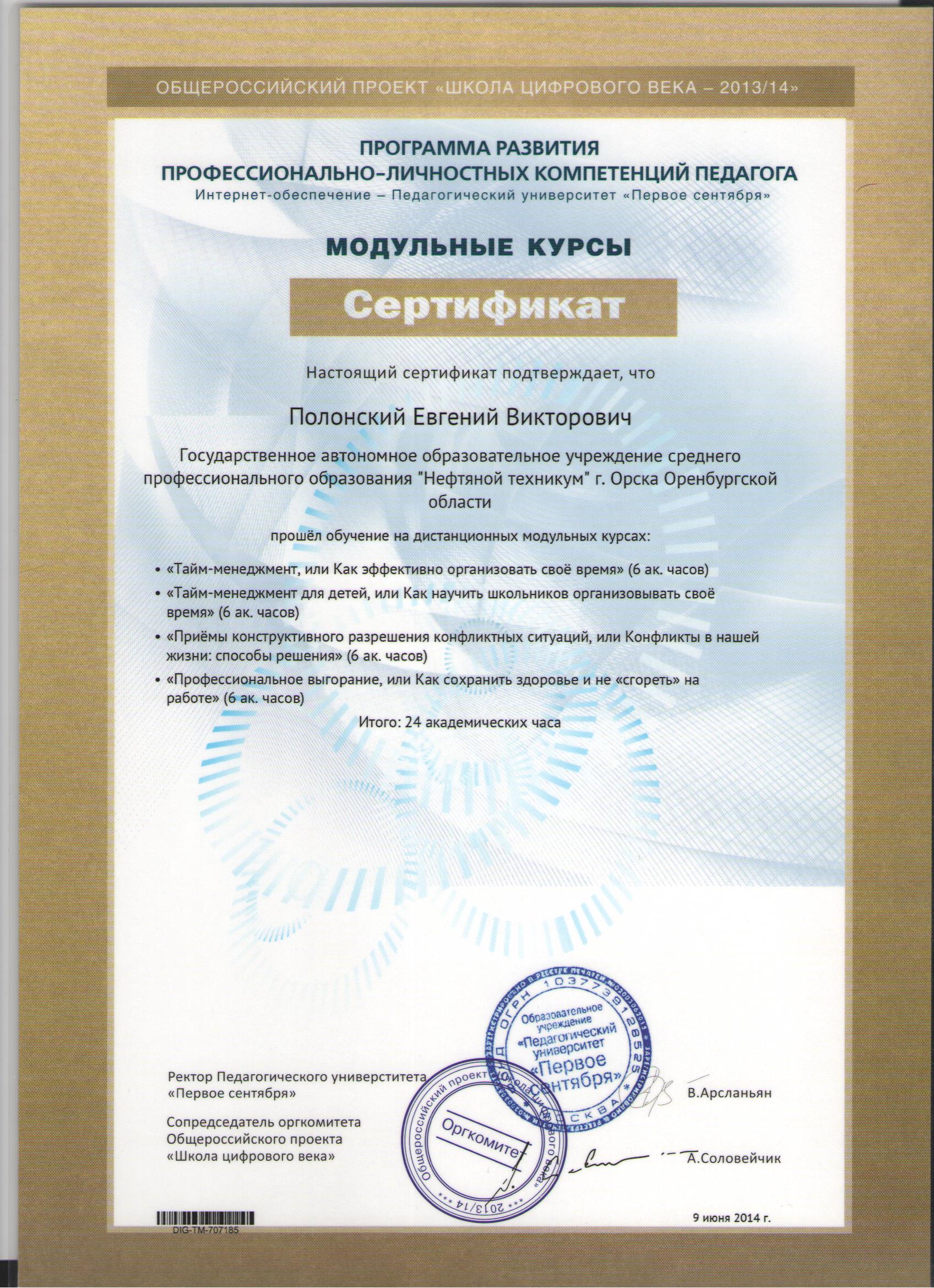 - 9 июня 2014 г. - Сертификат обучения на дистанционных модульных курсах в рамках общероссийского проекта "Школа цифрового века - 2013/2014 учебный год (24 часа)